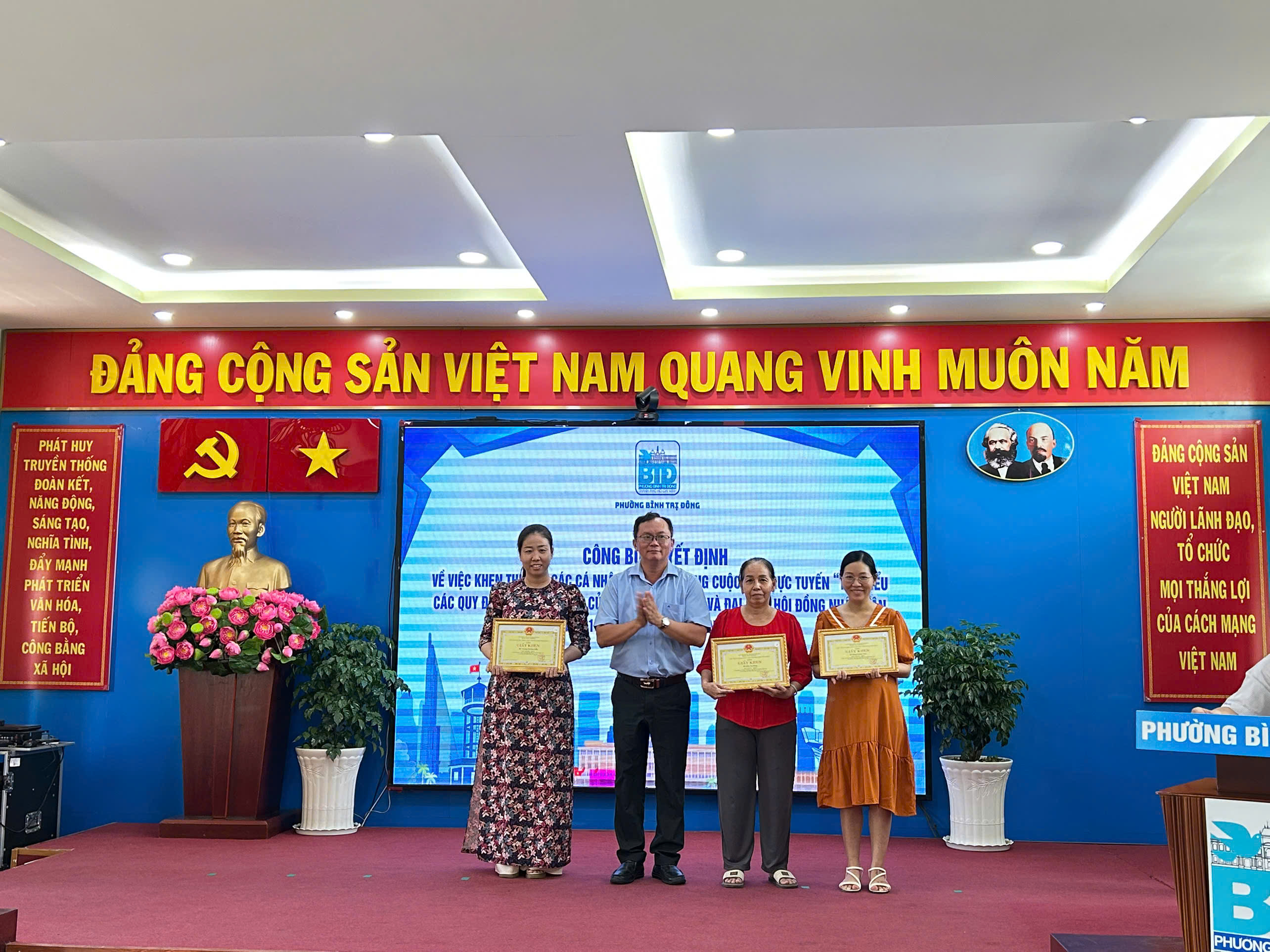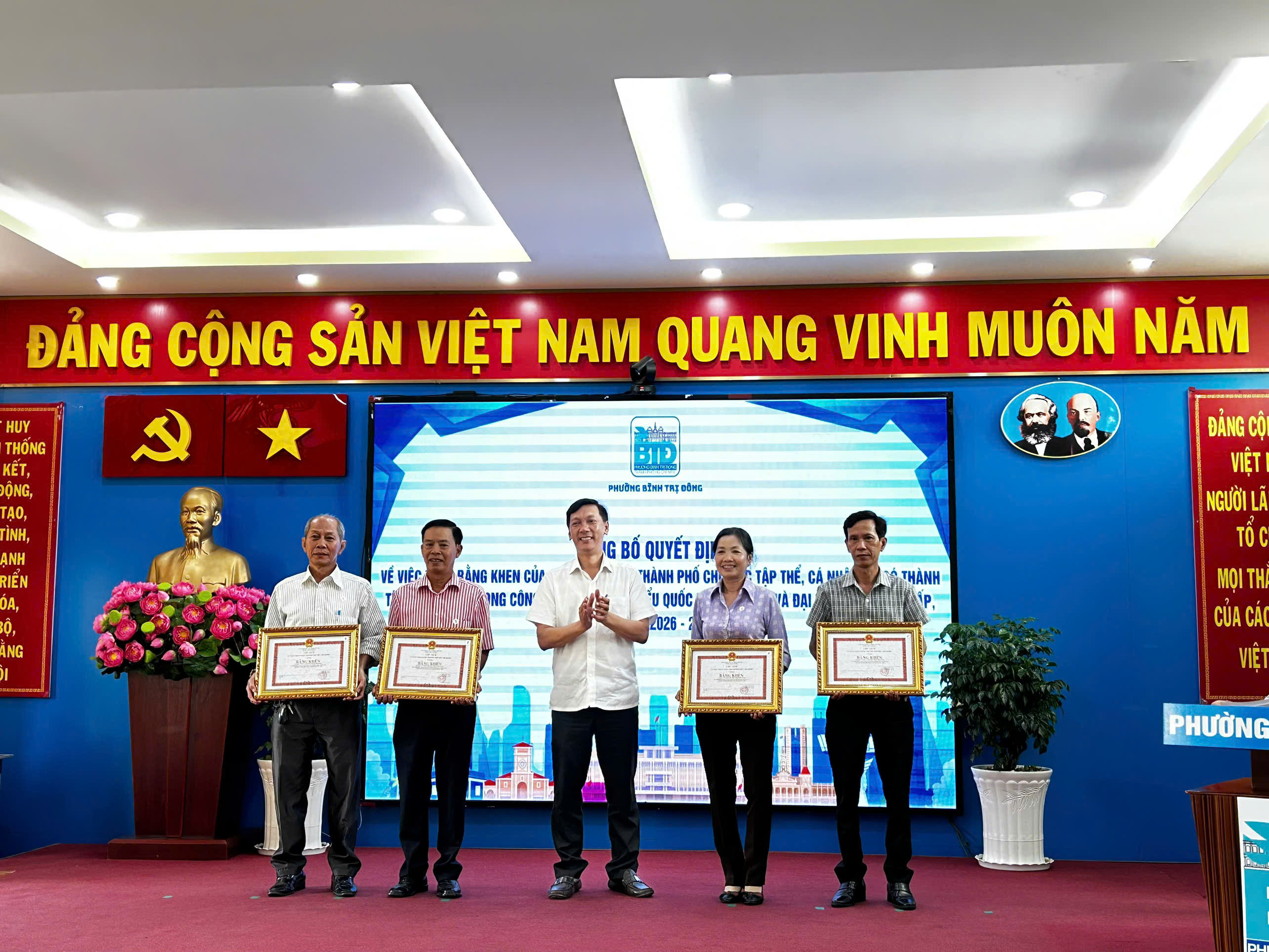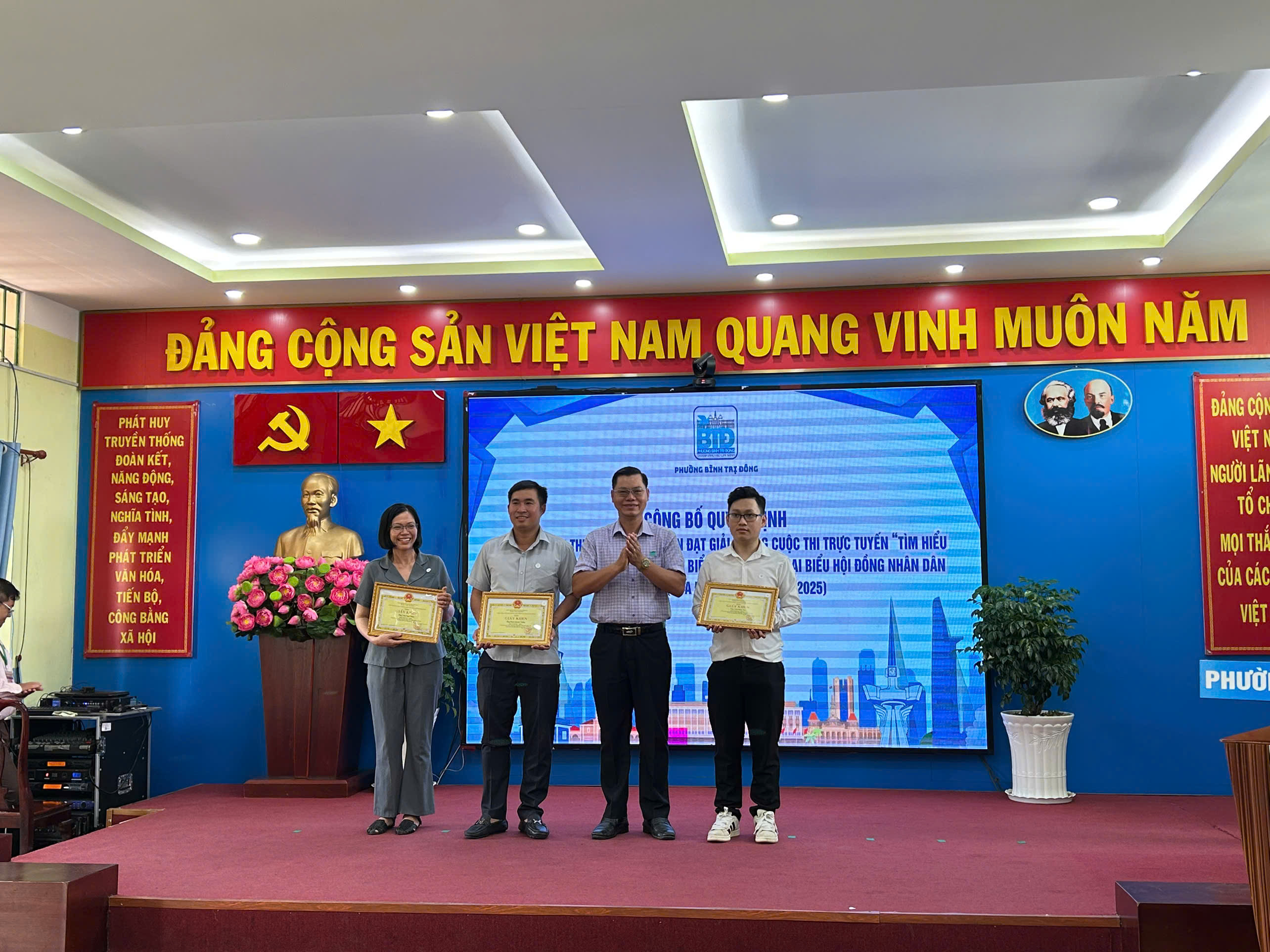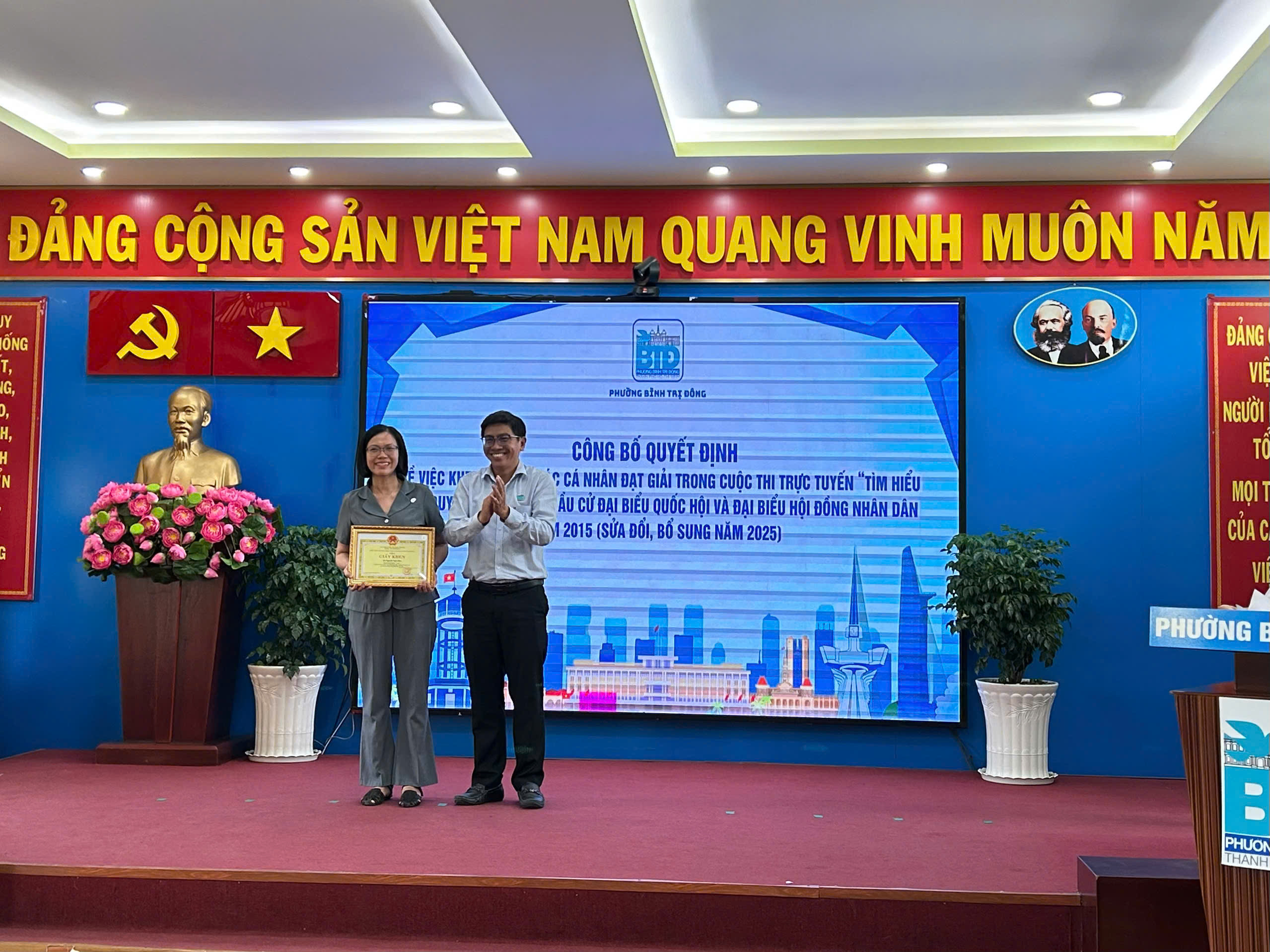 Dịp này, hội nghị cũng công bố các quyết định khen thưởng của Chủ tịch UBND Thành phố và UBND phường cho các tập thể, cá nhân có thành tích xuất sắc trong công tác bầu cử đại biểu Quốc hội khóa XVI và đại biểu HĐND các cấp nhiệm kỳ 2026–2031; đồng thời khen thưởng các cá nhân đạt giải trong cuộc thi trực tuyến tìm hiểu pháp luật về bầu cử.