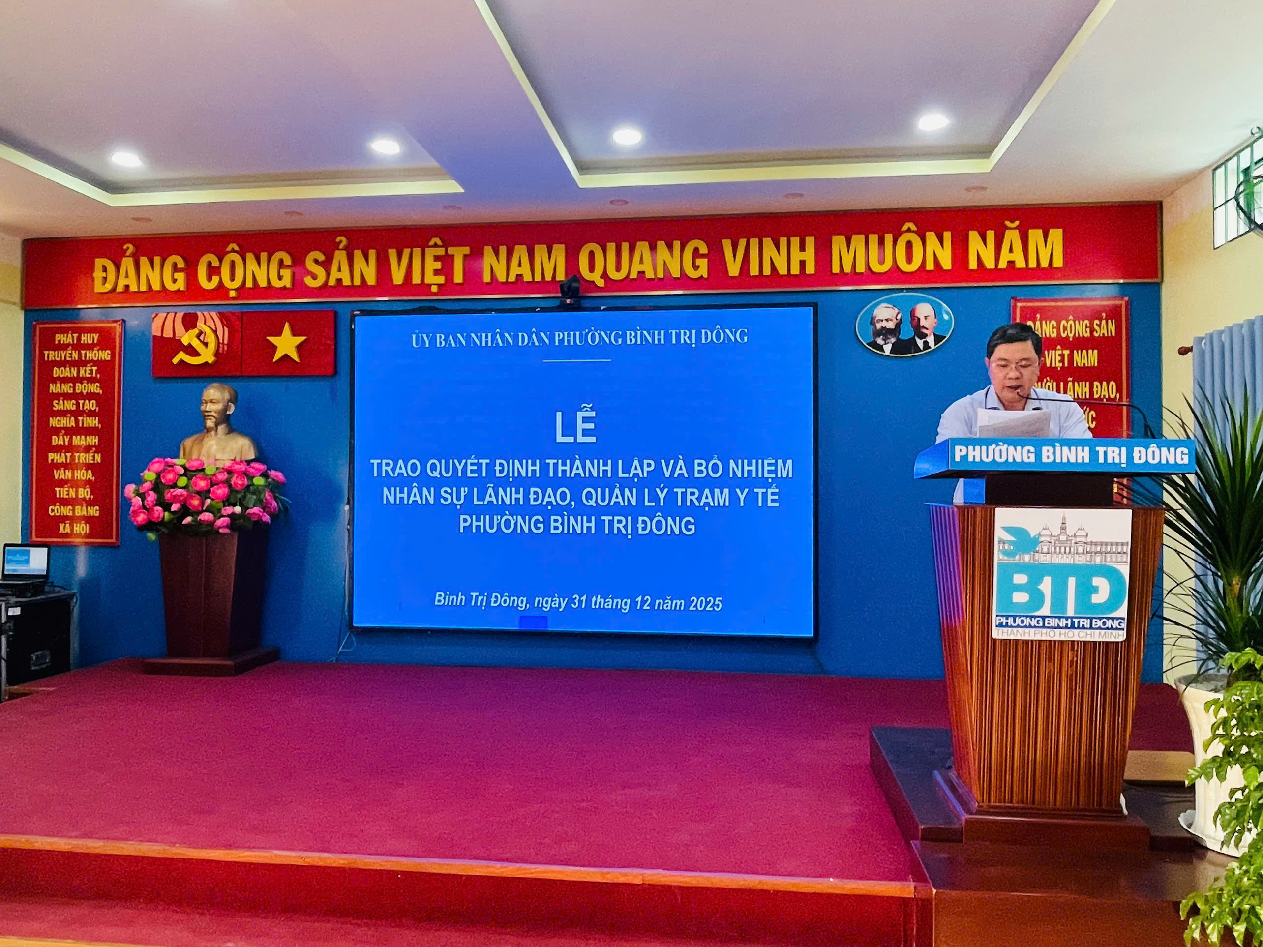 Tại buổi lễ, đồng chí Võ Minh Hoàng, Phó Trưởng Phòng Văn hóa – Xã hội phường công bố các quyết định gồm: thành lập Trạm Y tế phường Bình Trị Đông; điều động và tiếp nhận 36 viên chức Trung tâm Y tế khu vực Bình Tân (thuộc Sở Y tế TP.HCM).