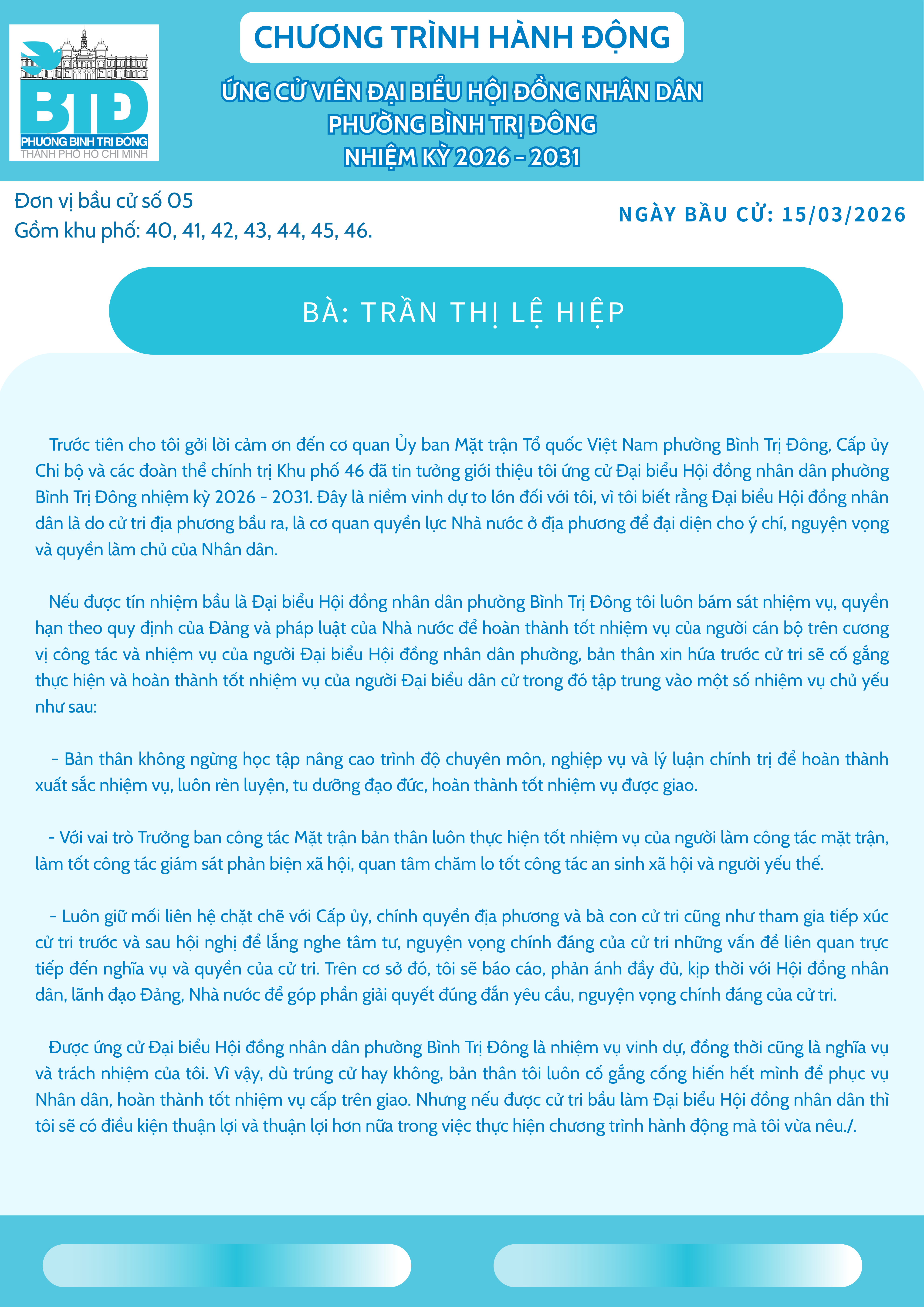 THÔNG TIN TIỂU SỬ VÀ CHƯƠNG TRÌNH HÀNH ĐỘNG BÀ TRẦN THỊ LỆ HIỆP ĐẠI BIỂU ỨNG CỬ HỘI ĐỒNG NHÂN DÂN PHƯỜNG BÌNH TRỊ ĐÔNG NHIỆM KỲ 2026 - 2031