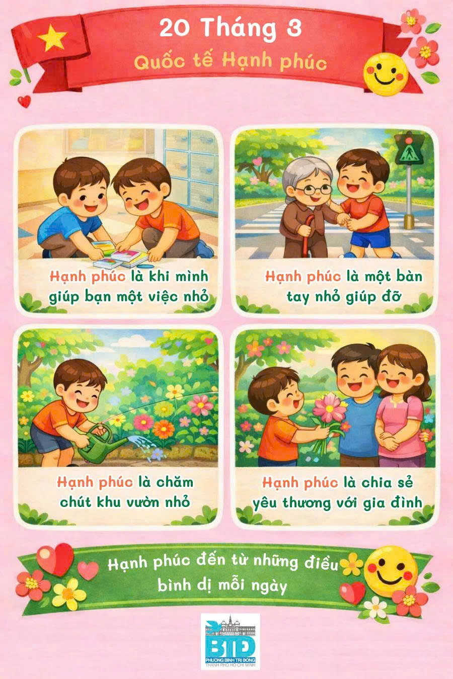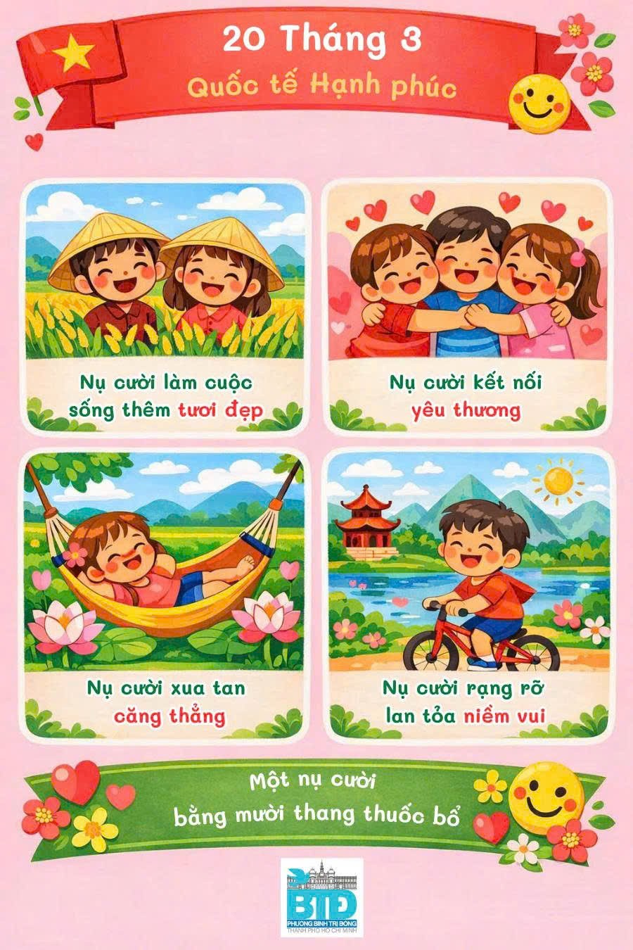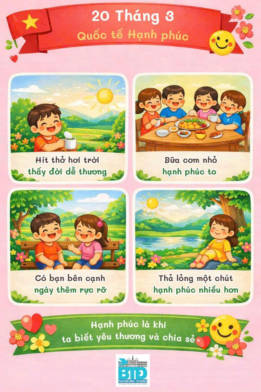 Ngày 20 tháng 3 hằng năm được chọn là Ngày Quốc tế Hạnh phúc – ngày để mỗi chúng ta cùng nhắc nhau sống chậm lại một chút, yêu thương nhiều hơn, sẻ chia nhiều hơn.